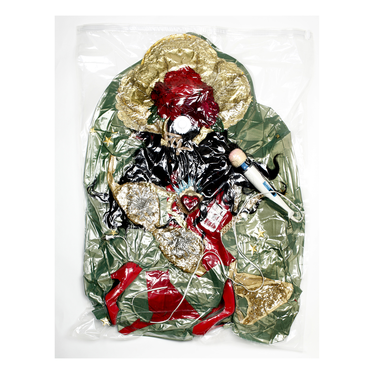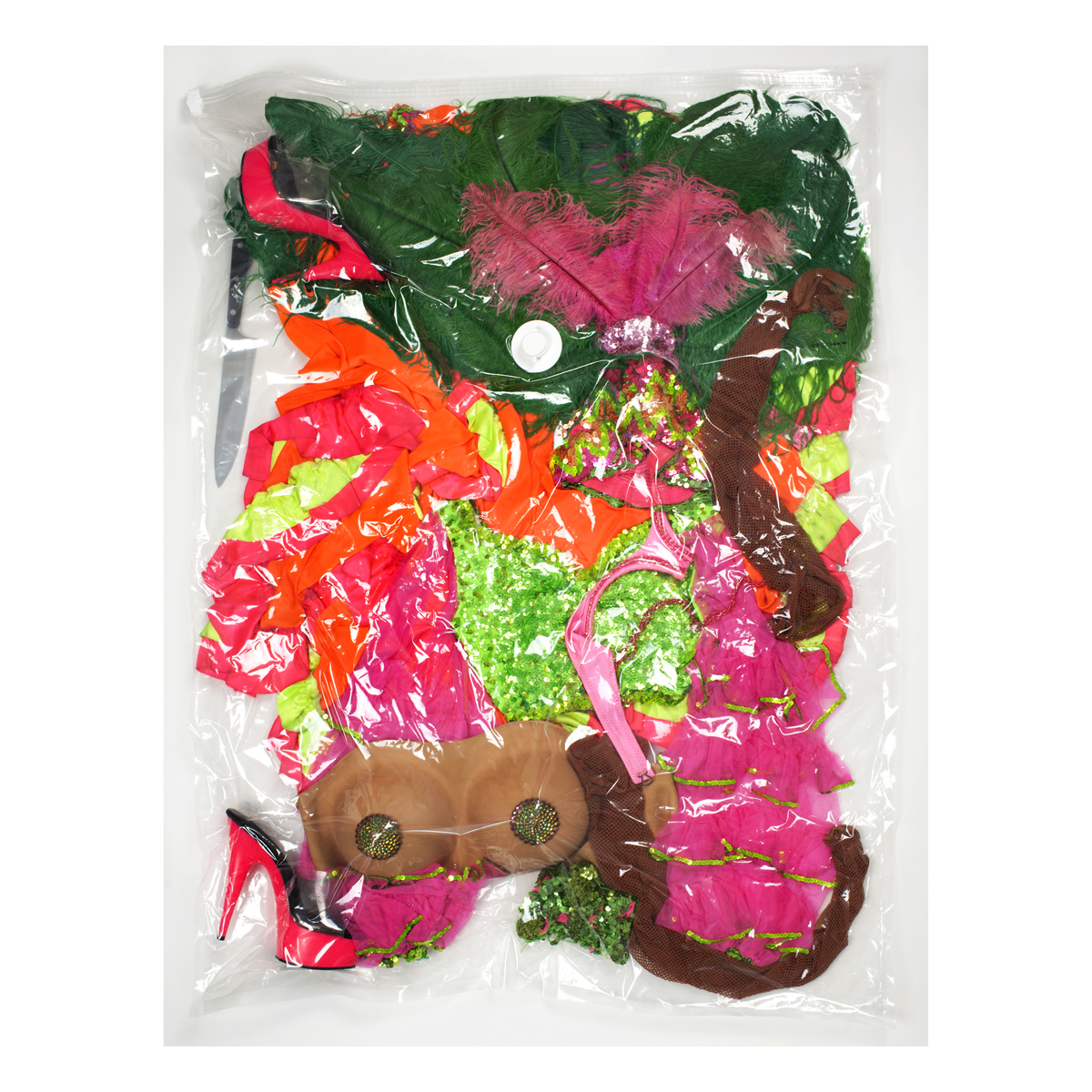 Inventory of Exhaustion is a solo exhibition of new visual works by Oakland-based performance artist Xandra Ibarra (a.k.a La Chica Boom). Featured will be a selection of large-scale photographic works titled Spic Skins, named after Ibarra’s parody-based performances: “spictacles.” The photographs feature vacuum-sealed costumes as artifacts of exhaustion, byproducts, empty spaces, voids, literally vacuumed of matter. The works become sites for locating Ibarra’s body without an image, incorporeal gestures of the self. These costumes as skins are thrown-off, separated, and become vacant forms of herself.